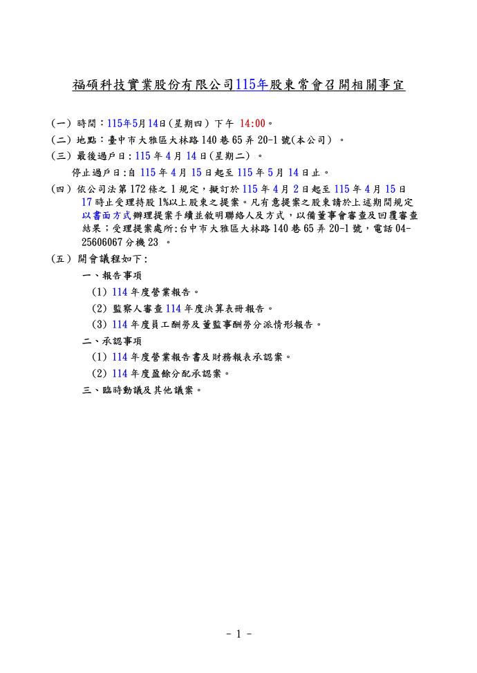 115年股東常會召開相關事宜
